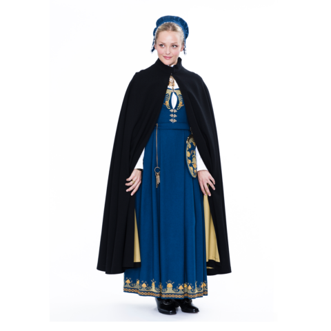 Kort jakke i same farge som bunaden eller lang cape; capen er svart til raud bunad og same farge som bunaden på dei andre alternativa. Bunadsjal i same farge som bunaden.